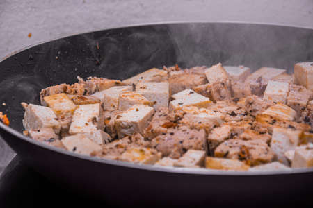 Close up from fried tofu in the hot pan making white smoke