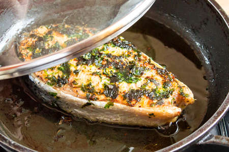 Fried red fish in a pan under the lid. Fry salmon in oil
