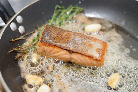 Salmon fillet being fried with thyme and garlic in butter