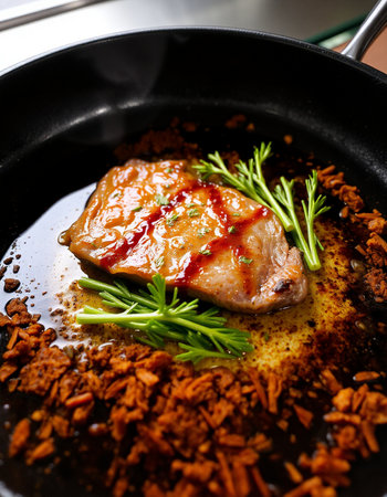 roasted duck breast with spices and herbs in a black frying pan