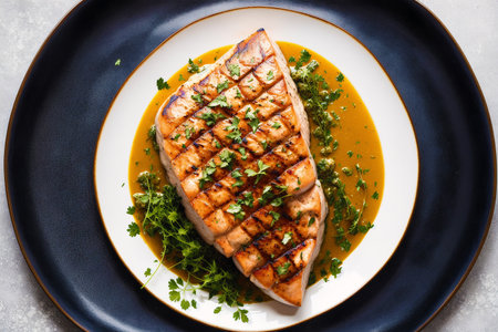 Freshly cooked salmon with vibrant sauce served in a restaurant