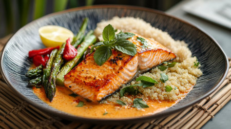 An elegant presentation of a salmon dinner with a side of quinoa, roasted asparagus, and a light citrus sauce, served on a sophisticated dining plate.