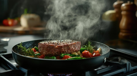 A sizzling hot pan on a stove, filled with vibrant vegetables and juicy meat, steam rising to create an inviting aroma, perfect for showcasing delicious home-cooked meals.