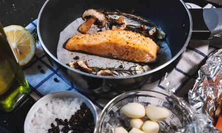 Steak salmon fillet in frying pan surrounding with ingredients