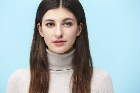 studio portrait of a beautful caucasian woman, looking at camera, isolated on blue background