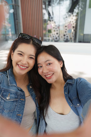 Friendship and Fun. Two women smiling together in a selfie outdoors.