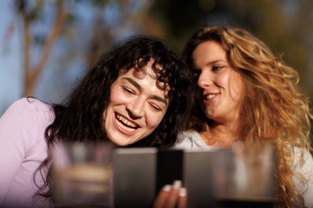 Two friends sharing a joyful moment outdoors, laughing and enjoying a digital device on a sunny day in a natural setting