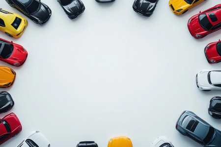 Various miniature car models are meticulously arranged on a white background, creating an inviting setup with room for additional text.