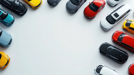 Various miniature car models are neatly arranged on a pristine white background, providing ample space for creative text and graphics.