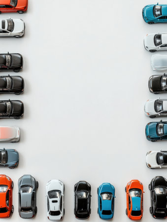 Colorful miniature car models are neatly organized on a white background, offering ample space for text and design elements.