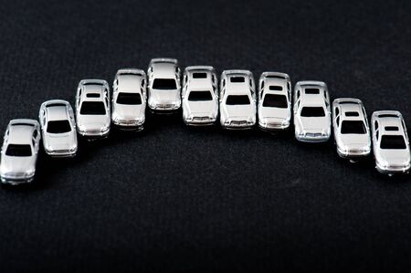 Various miniature car models are neatly arranged on a white background, showing an assortment of colors and styles with space for additional text.