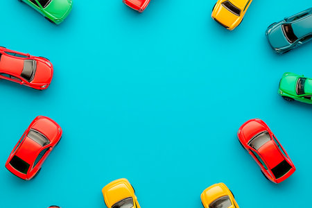 Colorful toy car collection in childrens playroom circle, top view, kids room decor