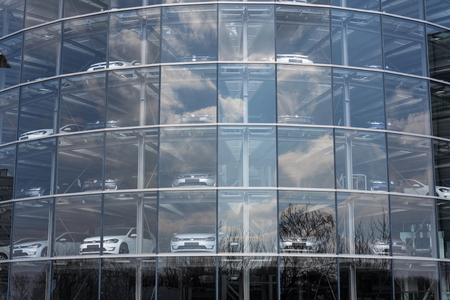 DRESDEN, GERMANY - APRIL 2 2018: Plug-in hybrid Volkswagen e-Golf electric cars stands behind glass in the Glaserne Manufaktur - Transparent Factory on April 2, 2018 in Dresden, Germany.