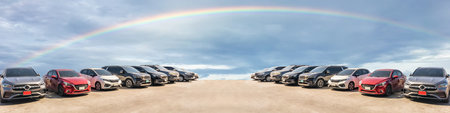 Cars for sale, vehicle or lot for dealership salon in parking or line up. Colorful, model or display