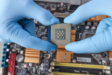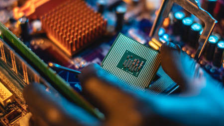 The engineer's gloved hand is holding the CPU chip against the background of the motherboard. Concept of high-tech hardware microelectronics