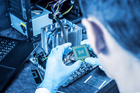 Computer and laptop hardware - CPU, fan cooler, battery, capacitors, radiator, chip. PC Repair, assembly, engineering background