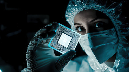 Close-up view of scientist in protective suit holding microcircuit