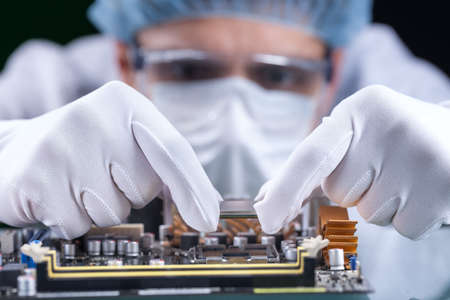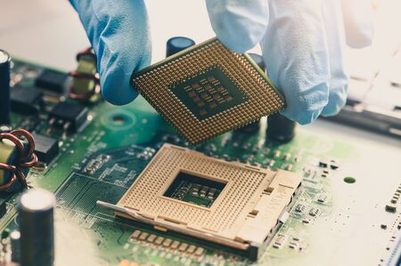 Electronic engineer of computer technology. Maintenance computer cpu hardware upgrade of motherboard component. Pc repair, technician and industry support concept.