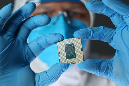 An engineer working in a laboratory wearing a special uniform and protective gloves holds new processor in hands and examines it