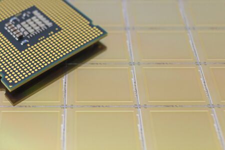 computer hardware. Processor lies on dark matte surface. close-up. CPUs, semiconductors, pins and connectors. Illustration: electronic and computing equipment. Semiconductor and microprocessor. Macro