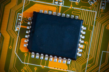 Macro photo of a black computer circuit printed board with selective focus on an blank chip. concept photo. Microchip manufacturing in Taiwan.