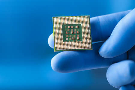 Close-up view on a new semiconductor microchip in gloved hand of computer scientist. Modern technology and hardware development