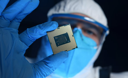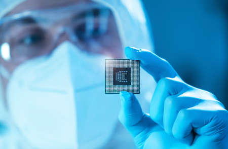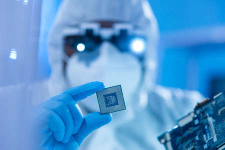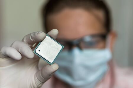 An engineer working in a laboratory wearing a special uniform and protective gloves holds new processor in hands and examines it