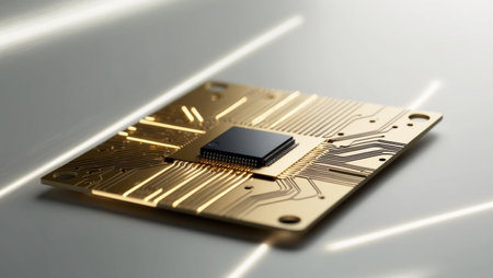AI Generated. Golden Circuit Board with Glowing Lines and Microchip