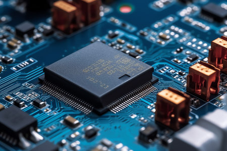 Close-Up of a Colorful Circuit Board with Microchip. Generative AI.