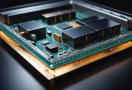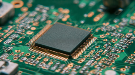 A close-up of a vibrant green circuit board showing a prominent black chip at its core, surrounded by intricate gold and silver wiring and precise solder joints,