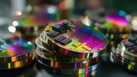A vibrant close-up of colorful semiconductor wafers stacked in a laboratory, showcasing intricate circuits and reflecting light, representing technological advancement.