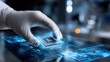 A person is holding a computer chip in their gloved hand. Concept of precision and delicacy, as the person carefully handles the small electronic component