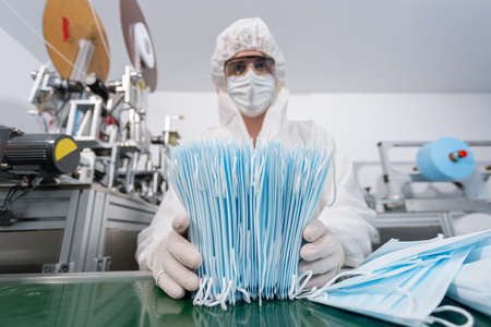 Close up medical masks at manufacturing machine with engineer production wear uniform checking quality, corporation manufacturer face mask.