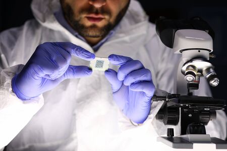Close-up of male hand holding computer microcircuit. Professional technician examining microchip with microscope. Computer electronics and technique concept