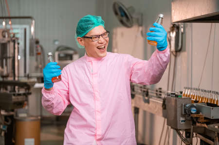 Asian man employee working Food quality control in Factory and worker inspecting production line beverage tanker in of dairy factory Concept food industry
