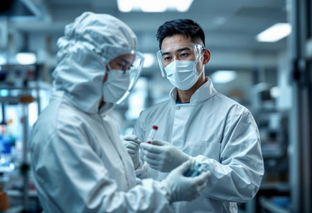 In a modern laboratory, two scientists engage in crucial research. One examines a sample while the other prepares a container, showcasing teamwork and innovation in science.