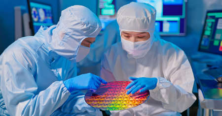 two asian technicians in clean room suit hold wafer with gloves that reflects many different colors and check it at semiconductor manufacturing plant