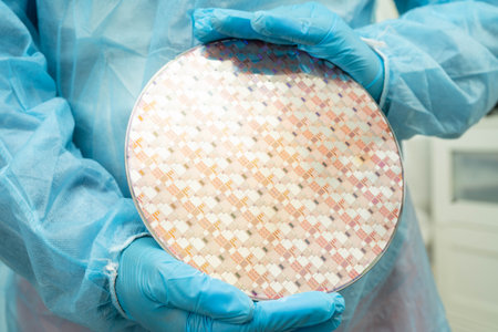A scientist in a clean room environment carefully holds two semiconductor wafers with blue gloves, showcasing advanced technology and precision in research and engineering.