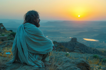 Elderly man with a contemplative expression, bearded face, curly hair, and wearing a patterned shawl. Text on the shawl visible. Soft lighting highlights facial details