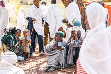 LALIBELA, ETHIOPIA, MAY 1st. 2019, Orthodox Christian Ethiopian family relaxing after mass in front of famous rock-hewn St. George's Church after Mass on May 1st. 2019 in Lalibela, Ethiopia