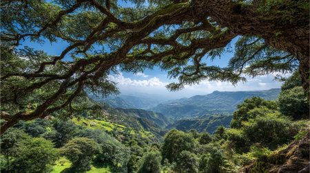 Stunning Mountain Vista Framed by Ancient Tree Canopy Against Clear Blue Sky
