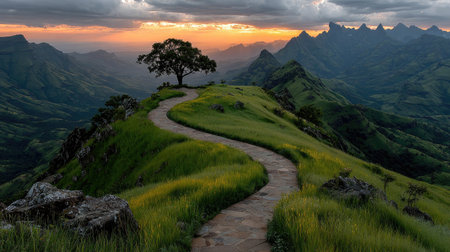 A winding path leading to the top of a green, grassy hill, with a lone tree standing tall on its side overlooking distant mountains at sunset. The trail is curving and detailed, with lush green grass covering its surface. A serene and peaceful scene. --chaos 20 --ar 16:9 --stylize 750 --v 7 Job ID: 444cf60e-3136-455c-9254-ec39a78619c0