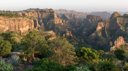 Wide angle view from the Simien Mountains on valleys and highlands in Tigray region, hit by the first golden sunlight. Northern Ethiopia, East Africa.