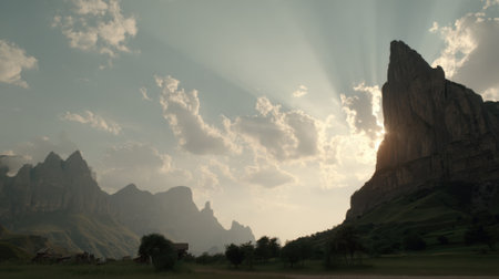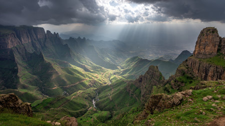 A breathtaking view of a dramatic mountain landscape showcasing lush greenery, rays of sunlight breaking through dark clouds, and a serene valley below.