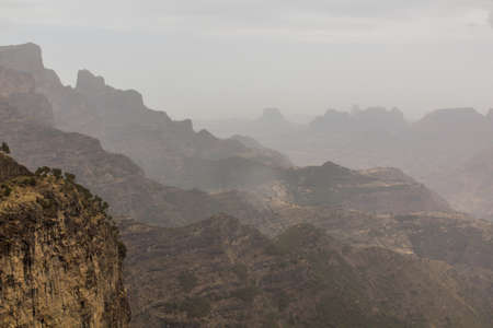 Telephoto view from the Simien Mountains National Park on the misty valleys, the silhouette of the rocky pinnacles and the barren highlands of the Tigray region. North Ethiopia, East Africa.