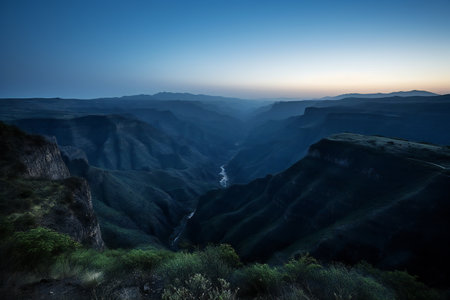 Landscape of Dagestan mountains, mountain range in haze in summer Russia