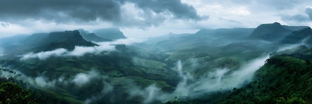 A breathtaking view of mist-covered peaks and verdant valleys, where the ethereal beauty of nature is on full display, creating a tranquil and enchanting atmosphere.