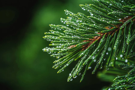 This image presents a stunning closeup view of a pine branch beautifully adorned with sparkling dew drops, effectively highlighting the intricate beauty and freshness found in nature all around us