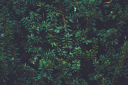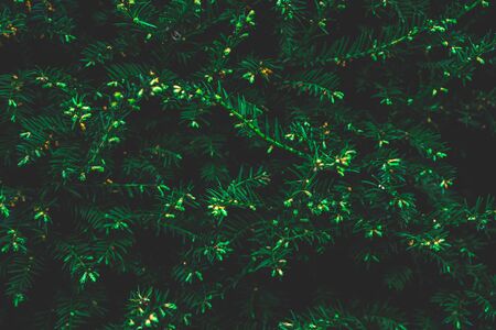 Texture of young green christmas needles on a dark background. Natural wallpaper.