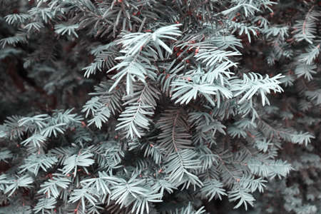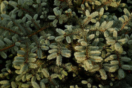 Christmas atmosphere. Green Christmas tree, coniferous tree. Blue, cold shade of needles.